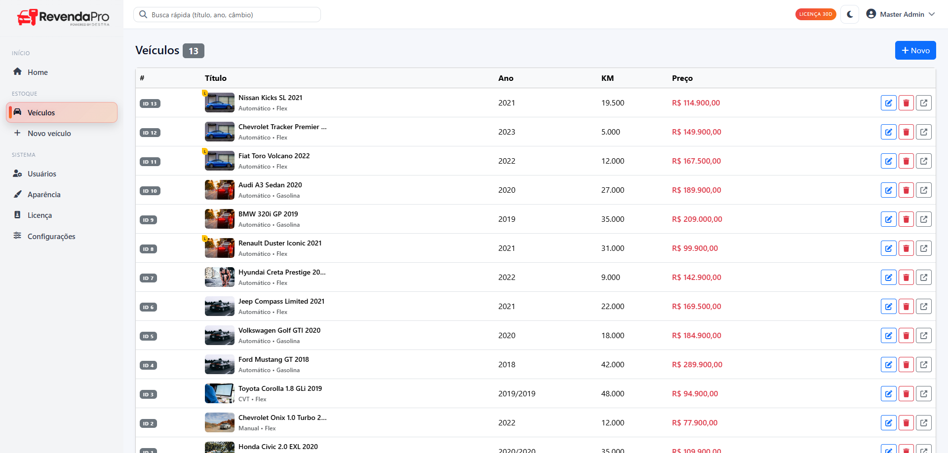 Gerenciador de estoque para revendas de veículos: cadastre, organize e publique seu catálogo com rapidez, relatórios essenciais e acesso por equipe