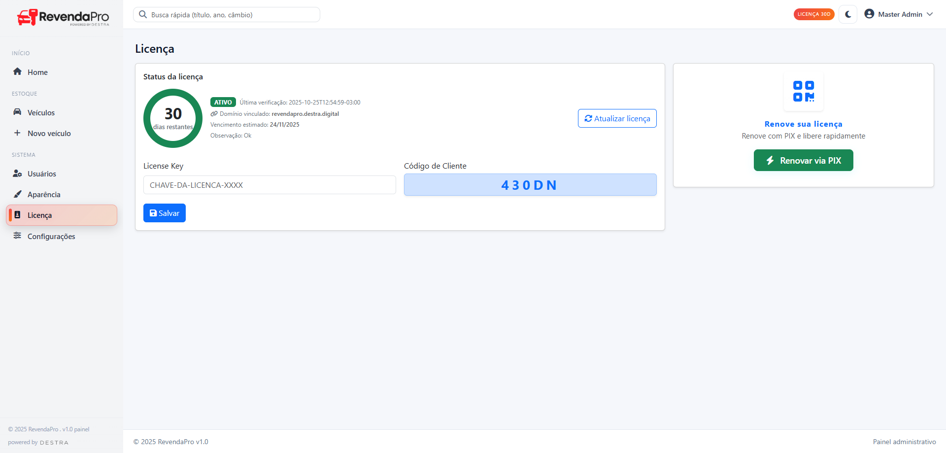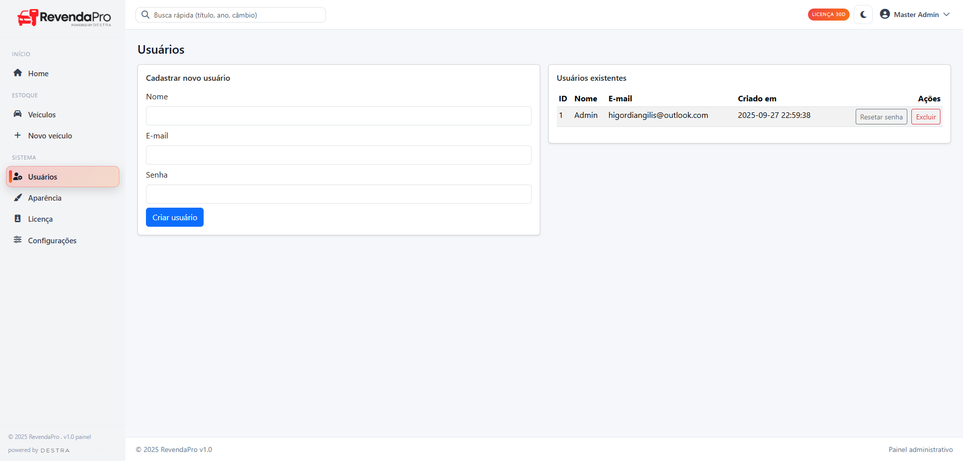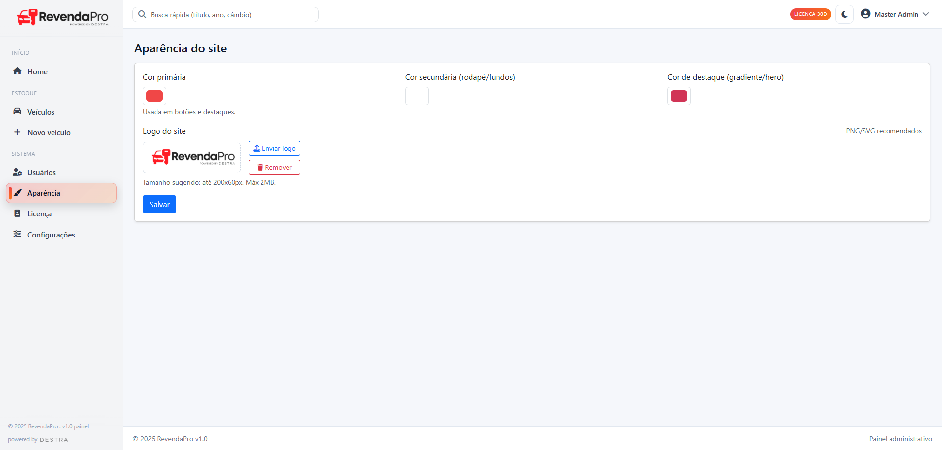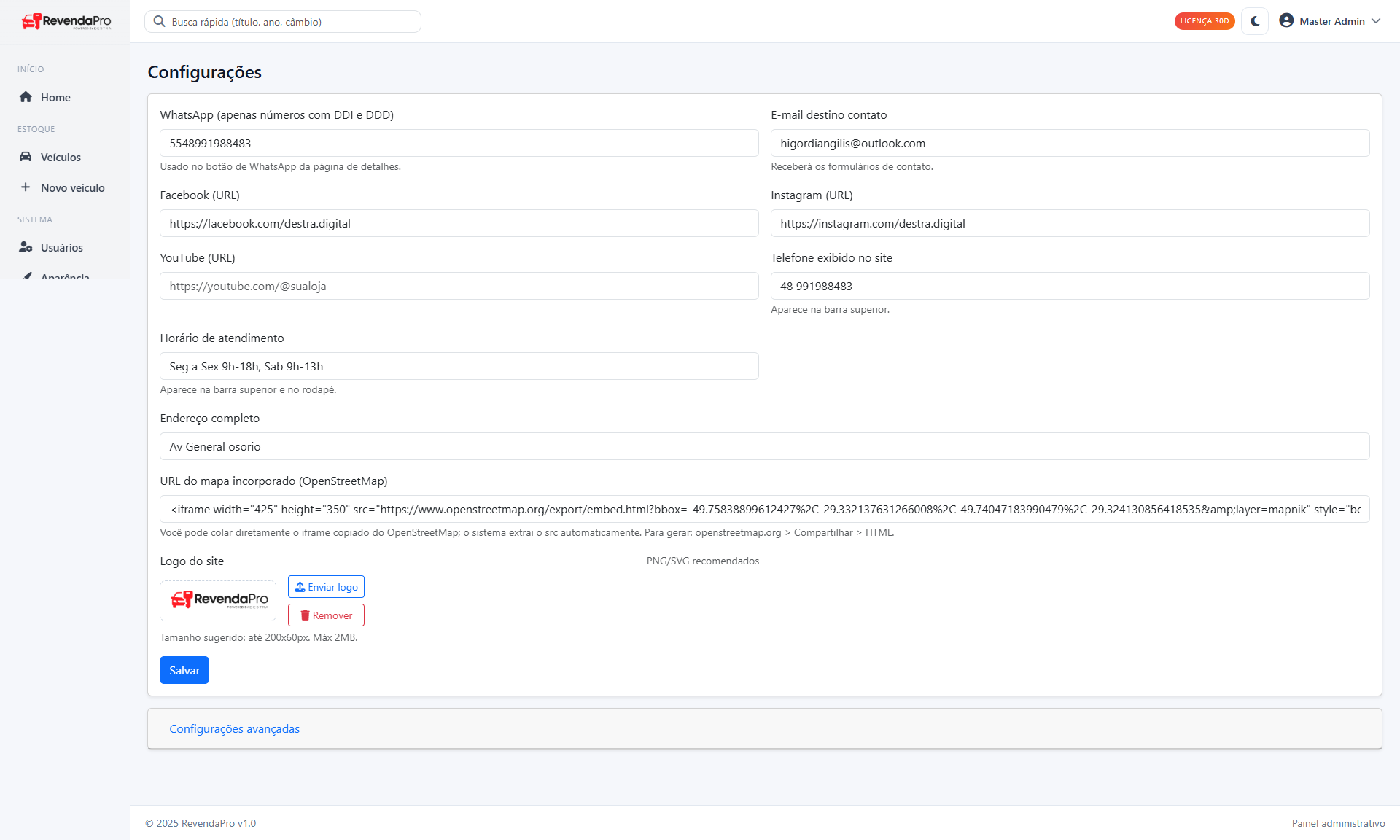 Interface fácil para gerenciar veículos, usuários, configurações, aparência e licença.